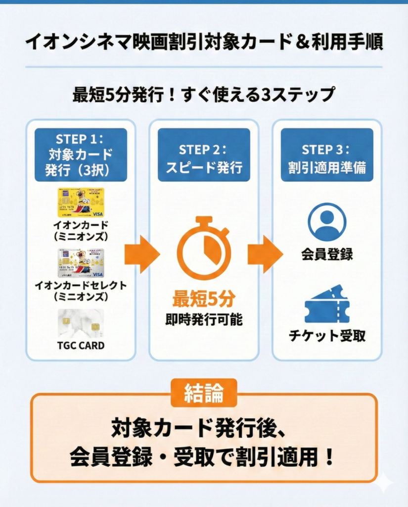 イオンカードの発行は最短5分で完了するため、すぐに割引特典を使いたい方にもおすすめだ。