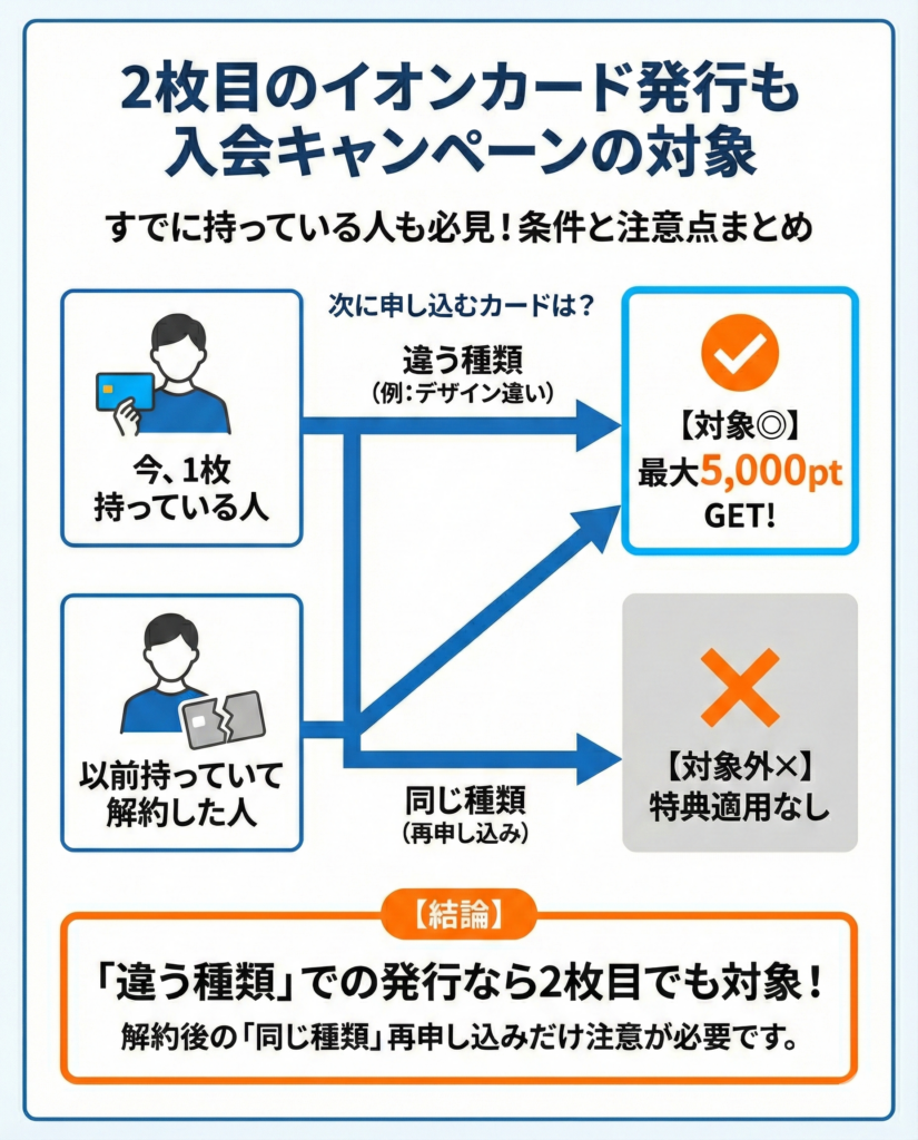 イオンカードの入会キャンペーンは、異なる種類の対象カードなら2枚目以降の発行でも適用される。