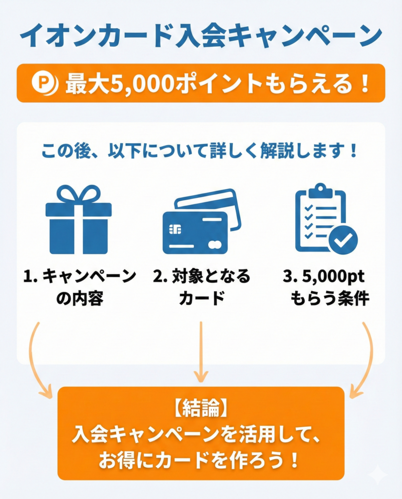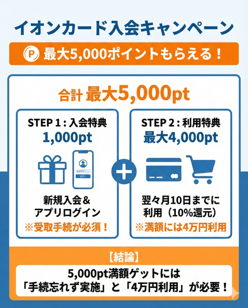 イオンカードを発行すると最大5,000WAON POINTもらえる、入会キャンペーンの詳細は以下のとおり。