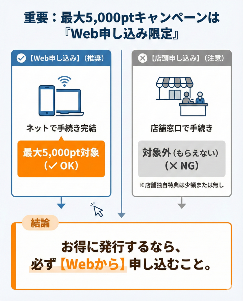 Webから発行すれば、最大5,000WAON POINTがもらえる入会キャンペーンの対象となる。