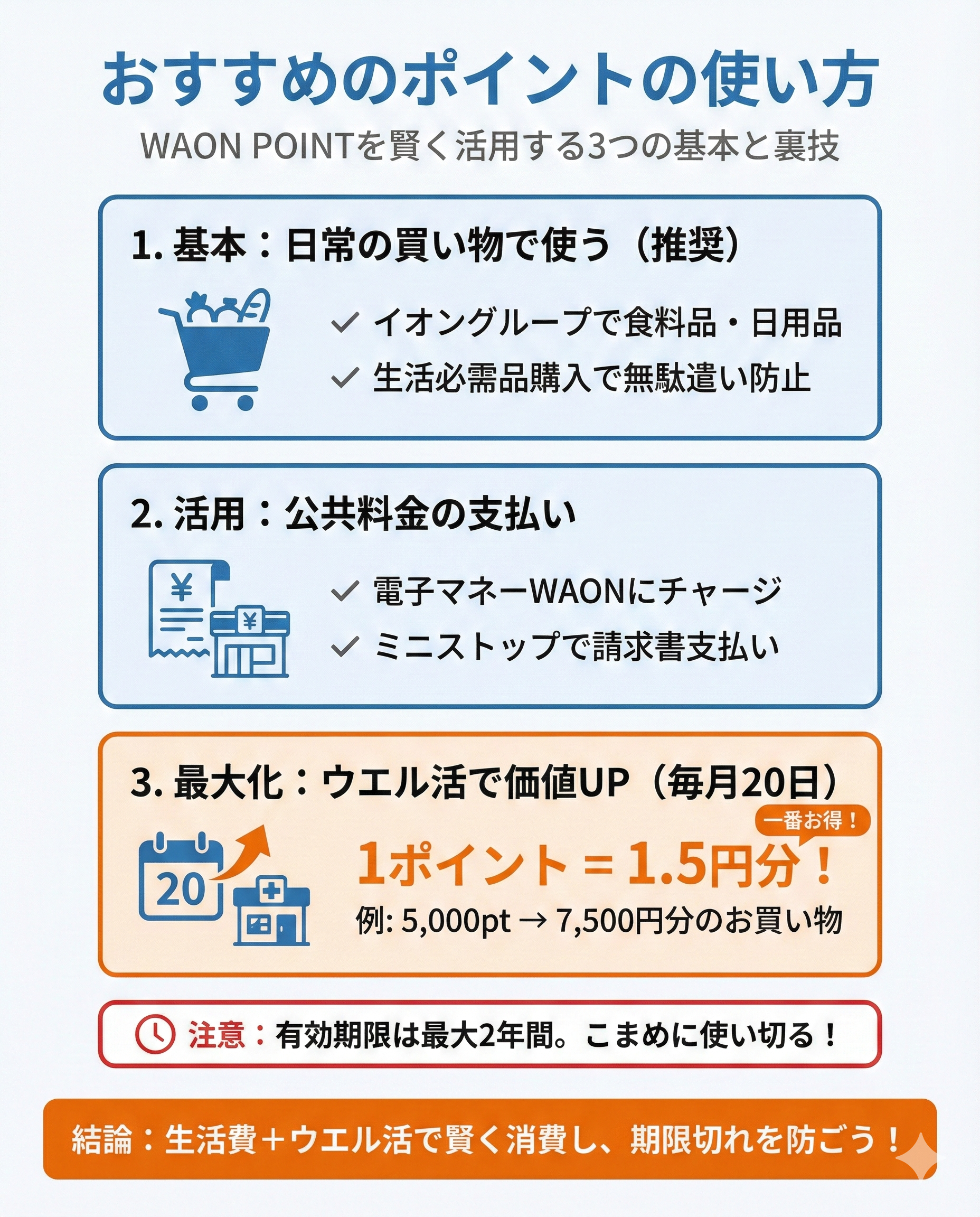 受け取ったWAON POINTはWAON POINT加盟店での支払い、電子マネーWAONへのチャージ、請求金額への充当などに使えるので、無駄にしないためにも活用しよう。