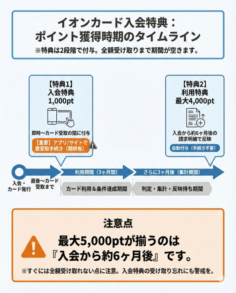 イオンカードの入会キャンペーンは、入会特典と利用特典でそれぞれもらえる時期が異なる。