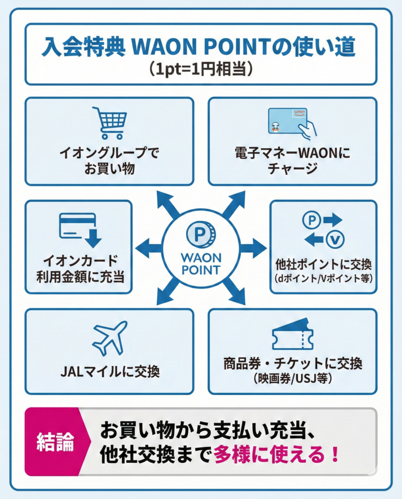 | 入会特典 | 新規入会で1,000WAON POINT ※イオンJMBカードは500マイル |