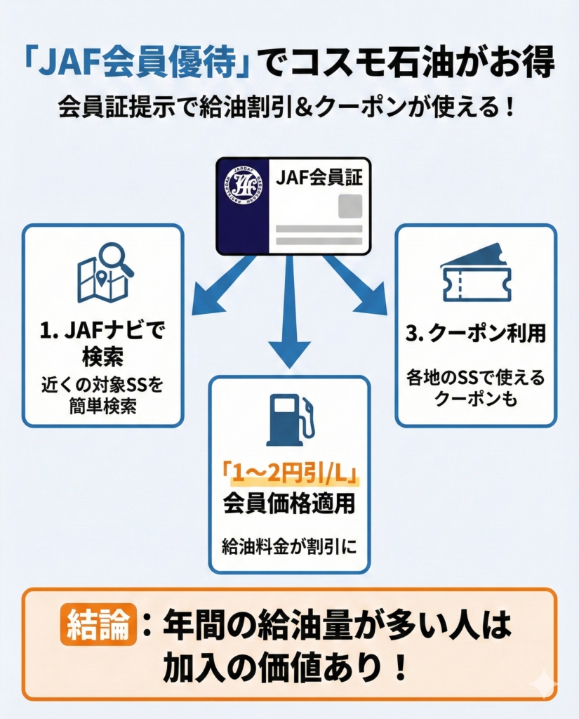 JAF(日本自動車連盟)の会員優待も、給油代を見直す際の候補になる。