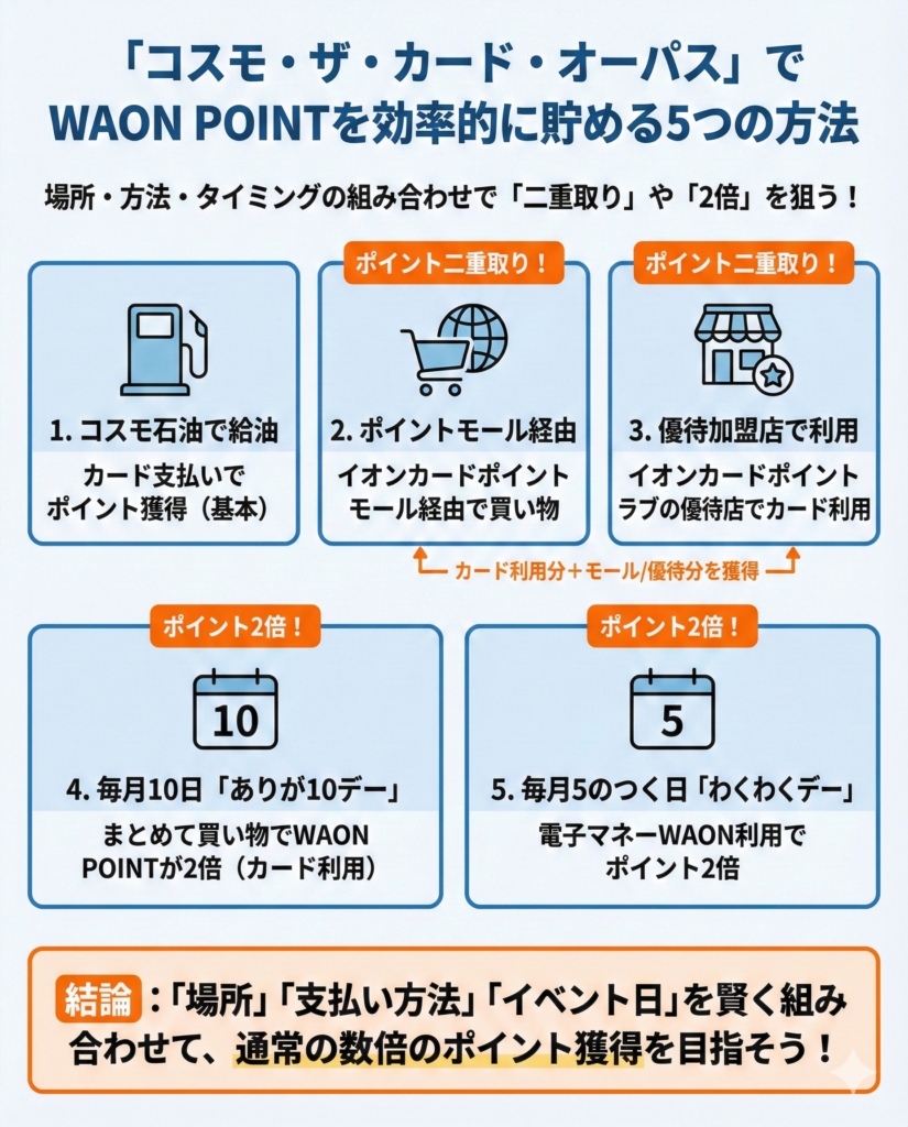 コスモ・ザ・カード・オーパスでWAON POINTを効率よく貯める方法は以下の通りだ。