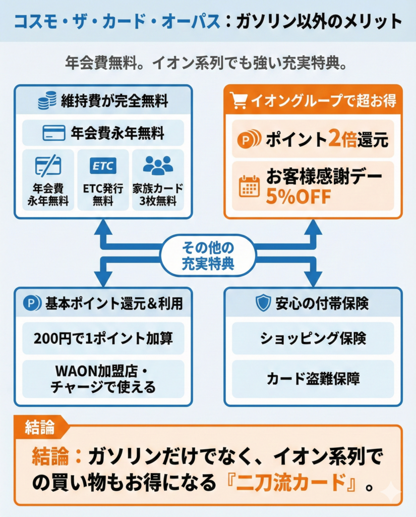 イオンカードとしての機能や特典はもちろん、コスモステーションでの給油をお得にしやすい。