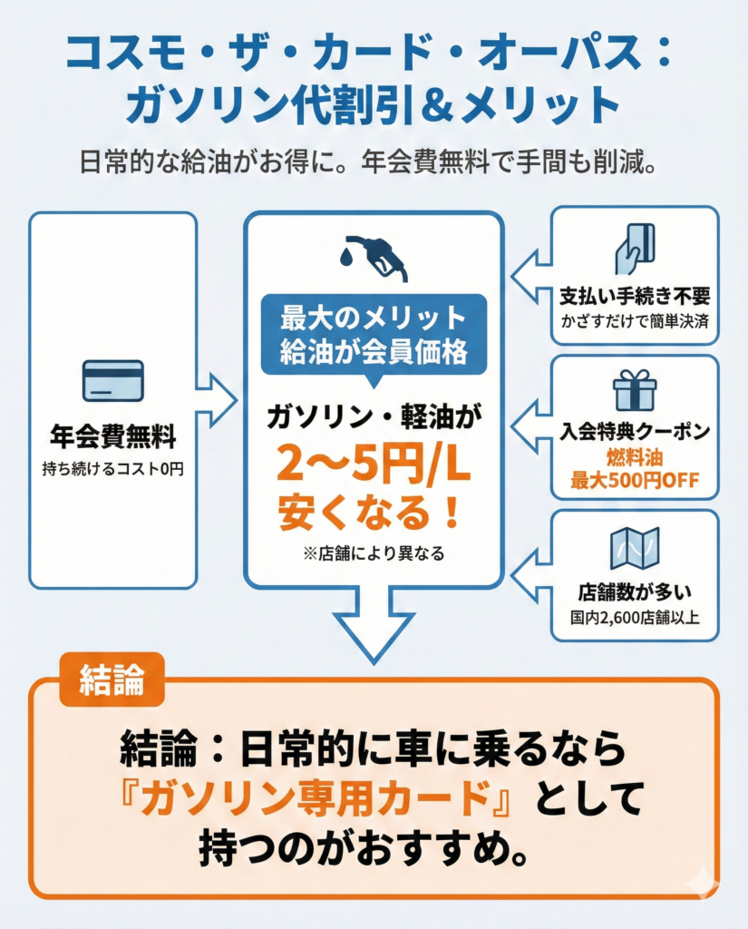 そこで注目したいのが、コスモ石油のガソリン代が割引になる「コスモ・ザ・カード・オーパス」だ。