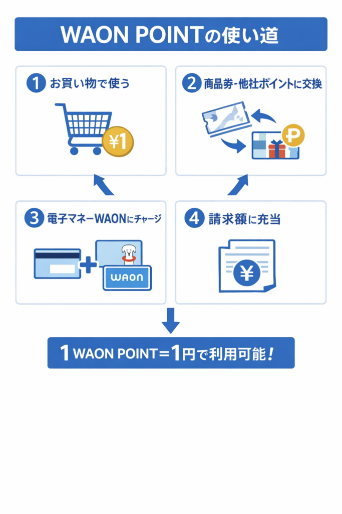 WAONステーションやイオン銀行ATMでポイントダウンロード・ポイントチャージすると、電子マネーWAONとして利用できる。なお、一度も電子マネーWAONへチャージしていない場合は、事前に現金やクレジットカードで1,000円以上のチャージが必要で、ポイントダウンロード・ポイントチャージ後にWAON POINTへ戻すことはできない。 - WAON POINTは、月々のご請求金額(ショッピング1回払い分)に1ポイント=1円から充当できる。毎月10日までの申込みで翌月2日(金融機関休業日の場合は翌営業日)のご請求分に充当される。