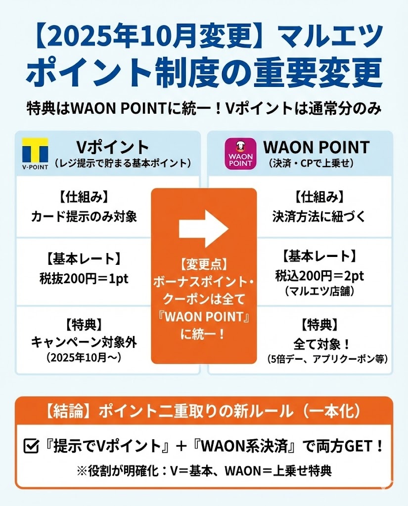 これより、マルエツでポイントを二重取りするなら、「提示でVポイント+決済でWAON POINT系の特典」という組み合わせに一本化されました。