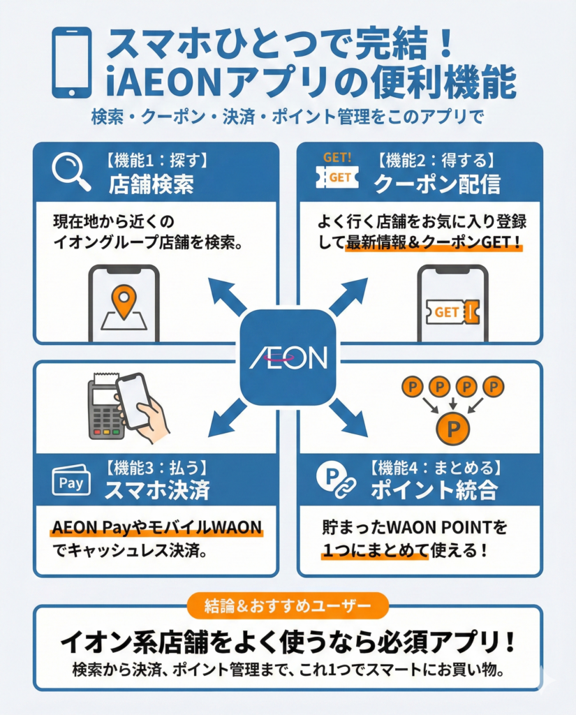 iAEONアプリの特徴や貯めたポイントの使い道について解説するので、ぜひ参考にしていただきたい。