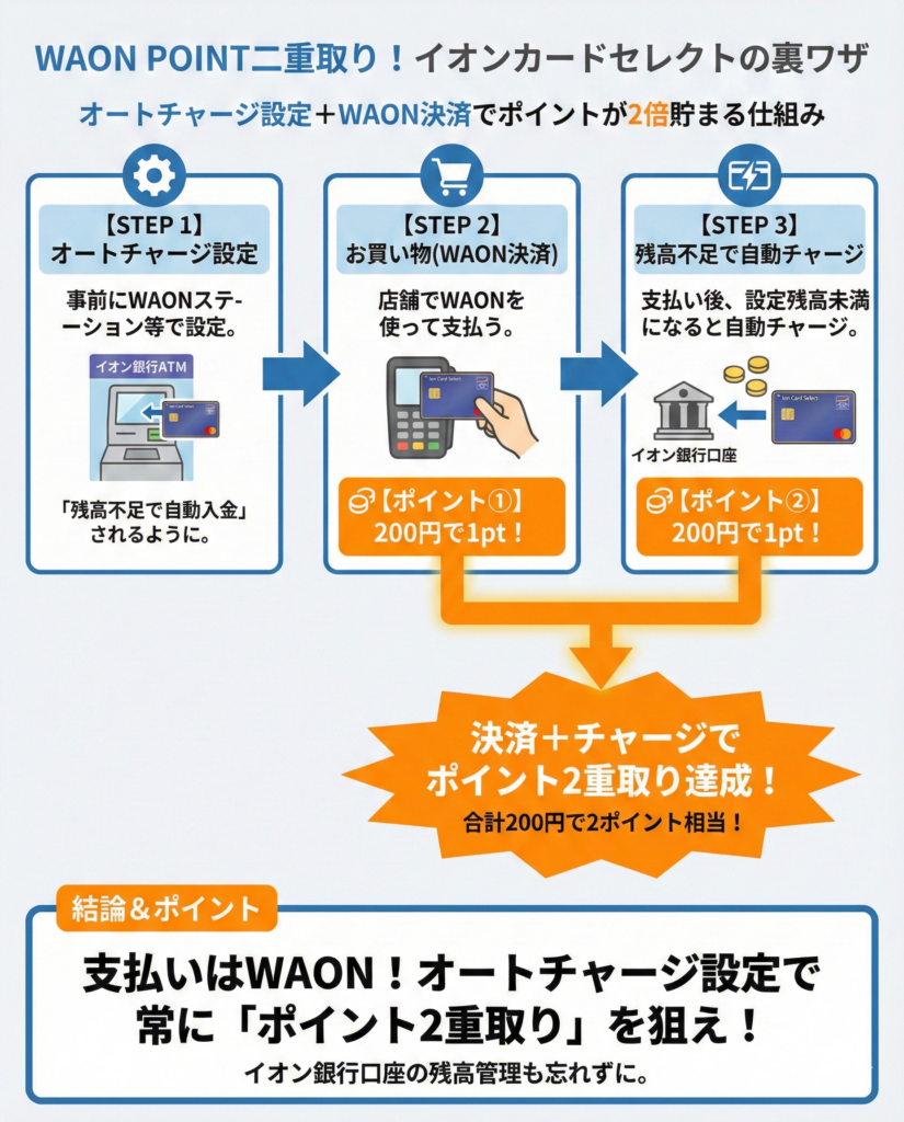 概要を簡単に解説すると、イオンセレクトカードでWAON POINTが貯まる仕組みとWAONオートチャージの機能両方を同時に活用するといった方法だ。
