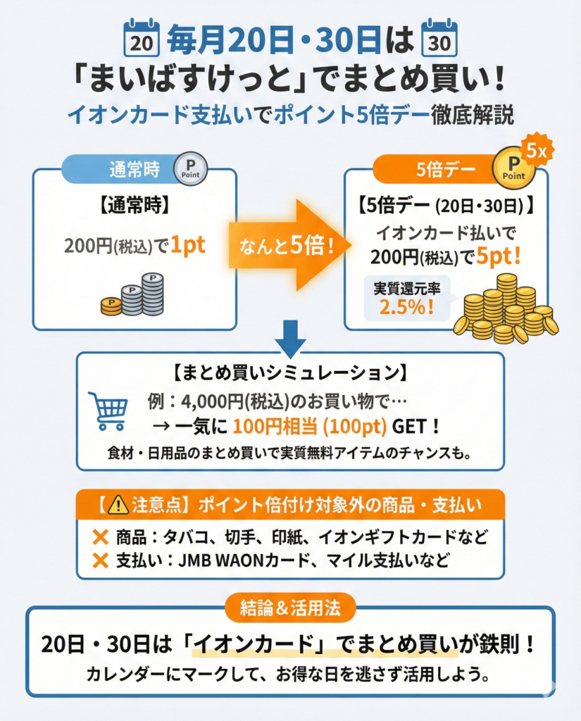 まいばすけっとでは、毎月20日と30日に「基本のポイント5倍デー」が開催される。