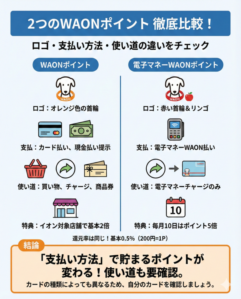 イオンマークのカードで関係するポイントには、「WAON POINT」と、これまで電子マネーWAONの利用で貯まっていた「電子マネーWAONポイント」がある。2026年3月以降、電子マネーWAONポイントは順次WAON POINTへ統合されており、現在保有している電子マネーWAONポイントは引き続き利用できる。