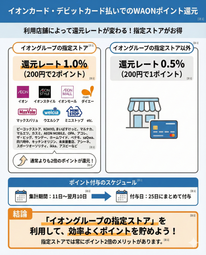 イオンカードもしくはデビットカードで支払ったときは「WAON POINT」が貯まる。ただし、下記の通り利用するお店によって還元レートが異なる。