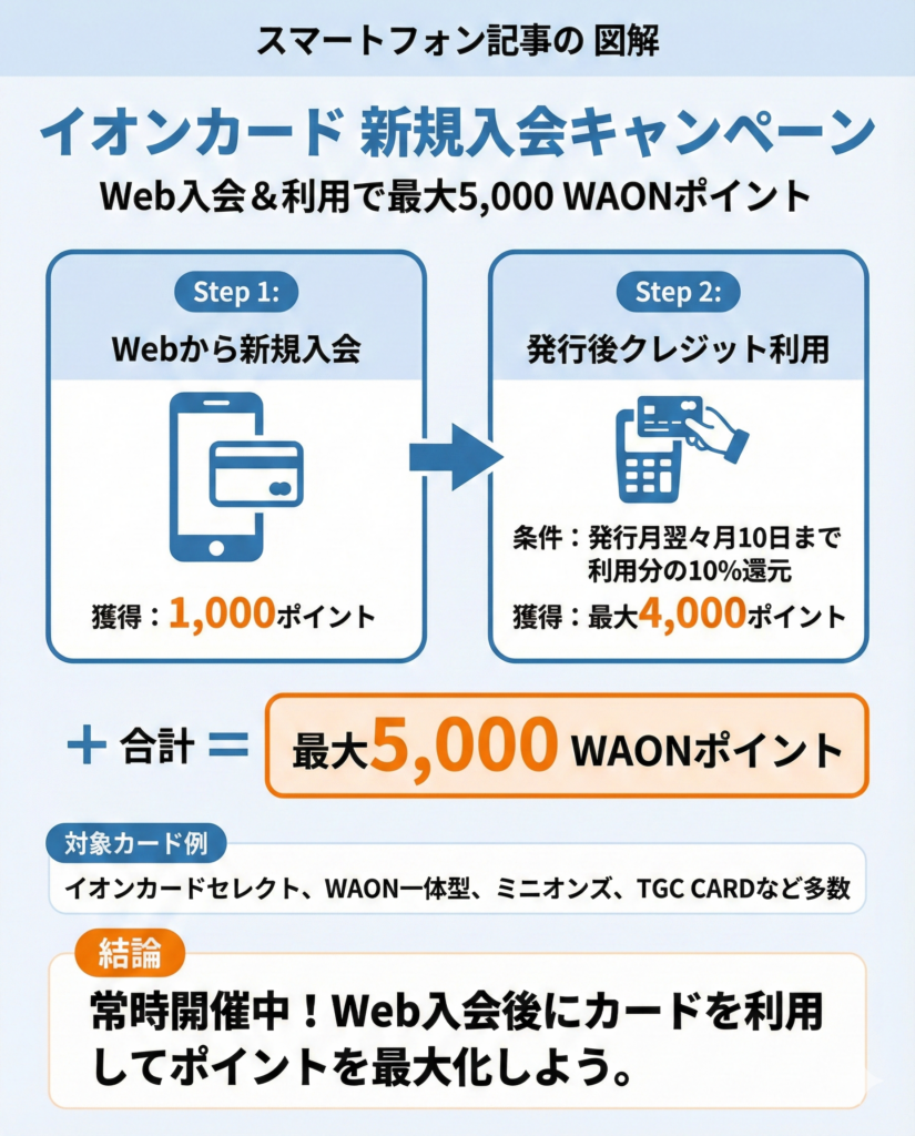 イオンカードでは、新規入会向けのキャンペーンが実施されている。特典内容や進呈条件、対象カードは時期によって異なる。