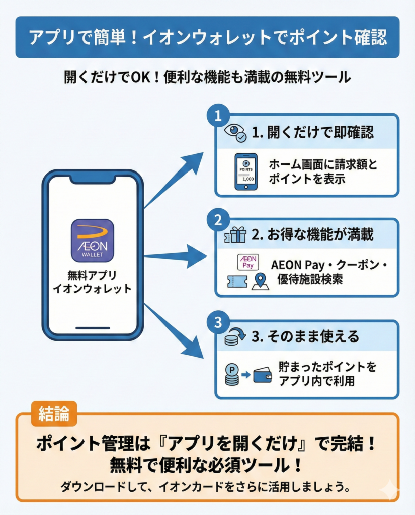 イオンカードで貯まったポイントは、下記3つの方法で確認することができる。