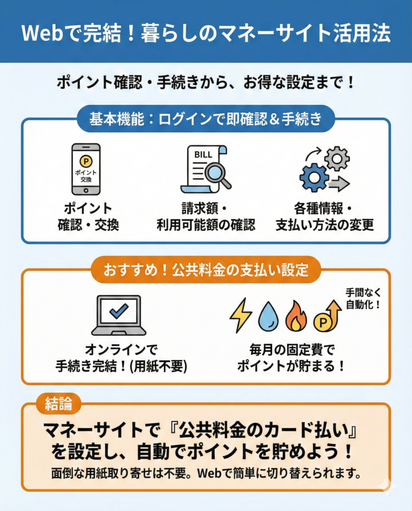 暮らしのマネーサイトから手続きできる加盟店もあり、メニュー内の「各種公共料金のお支払い」から申し込みできる。