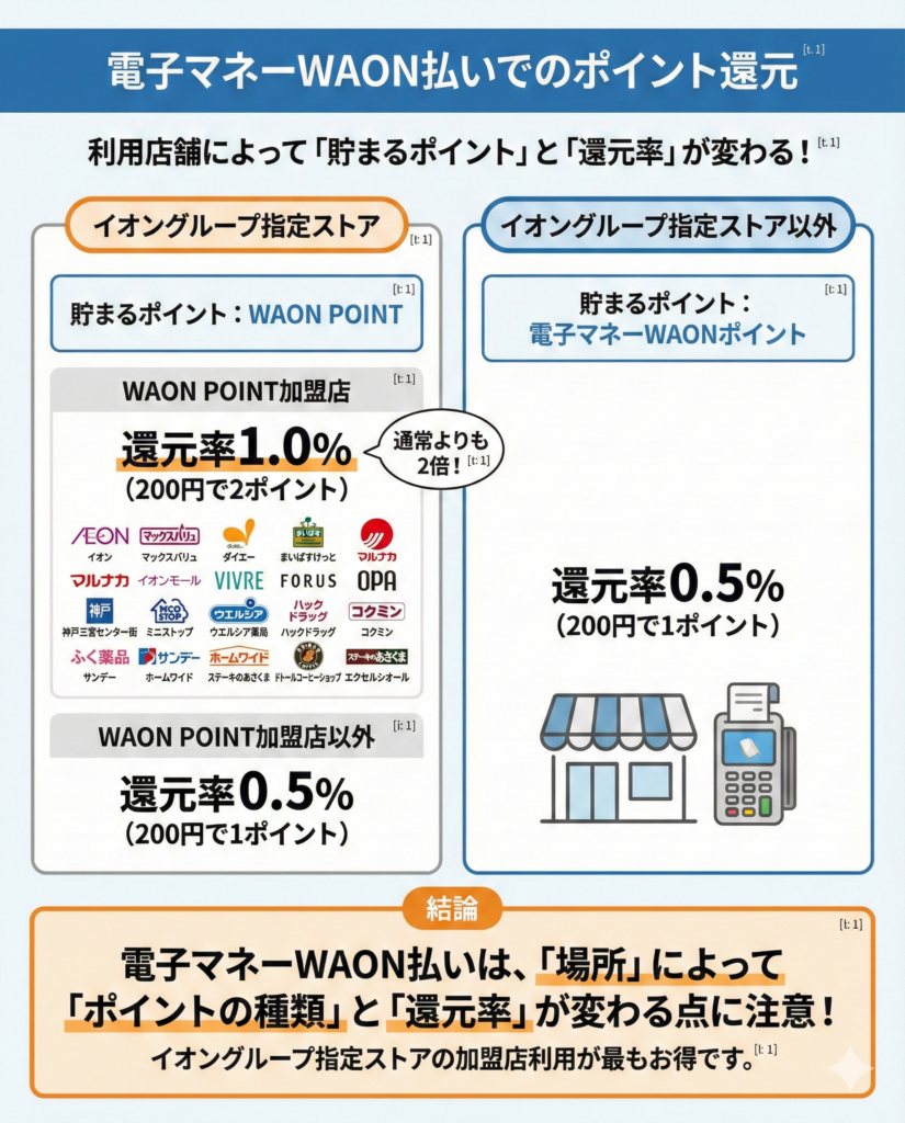 | 電子マネーWAON | イオングループ対象店舗 | WAON POINT | 1.0%※1 |