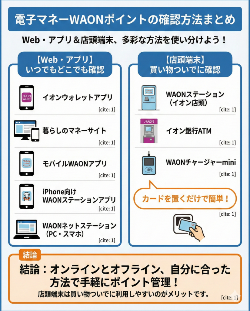- イオンフィナンシャルサービス『電子マネーWAONポイント数を確認する方法を教えてください。』(公表日/更新日:2026-02-27)