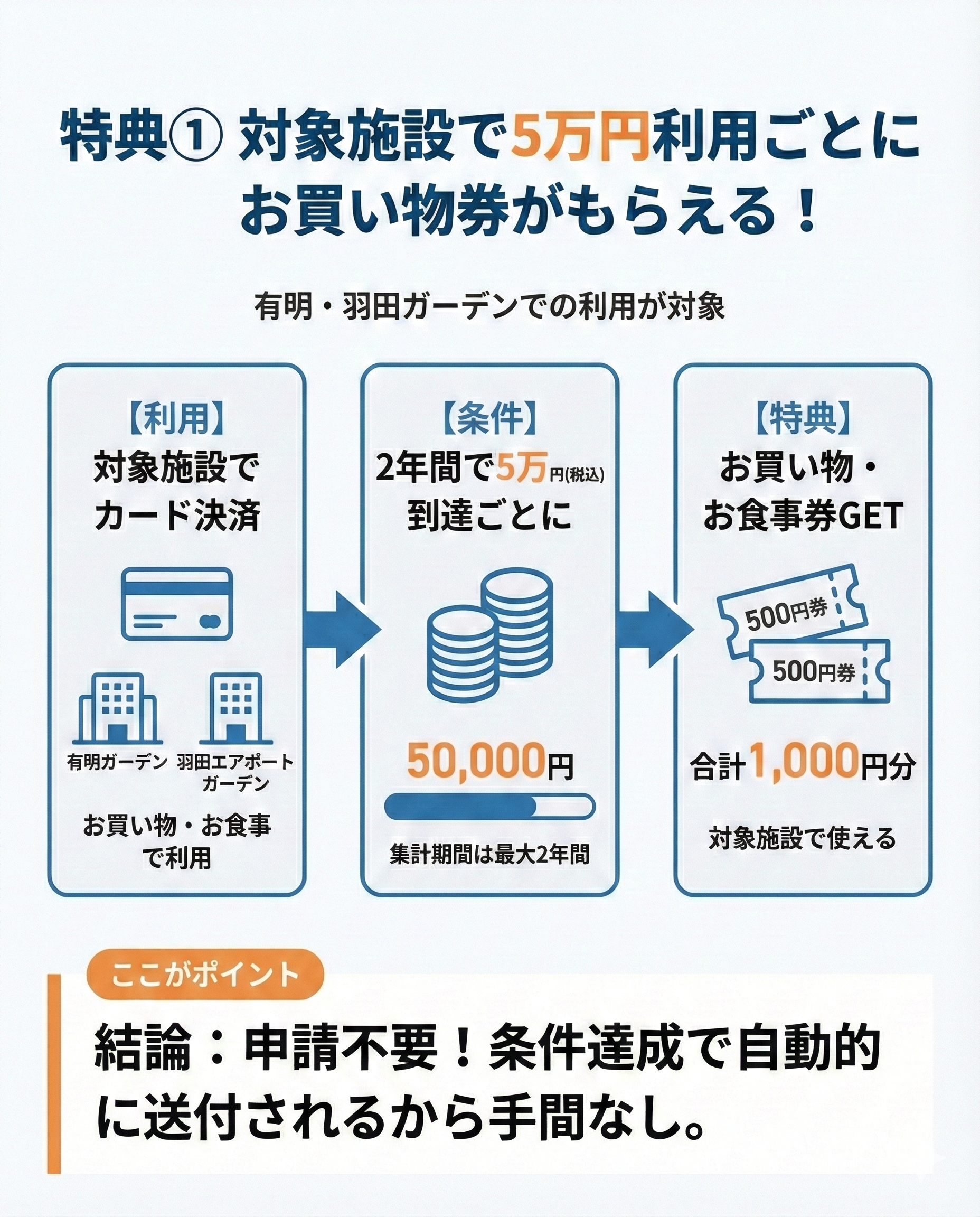 対象となるのは、有明ガーデン・羽田エアポートガーデン内での利用で、支払金額50,000円(税込)につき500円券のお買い物券・お食事券が2枚プレゼントされる仕組みだ。
