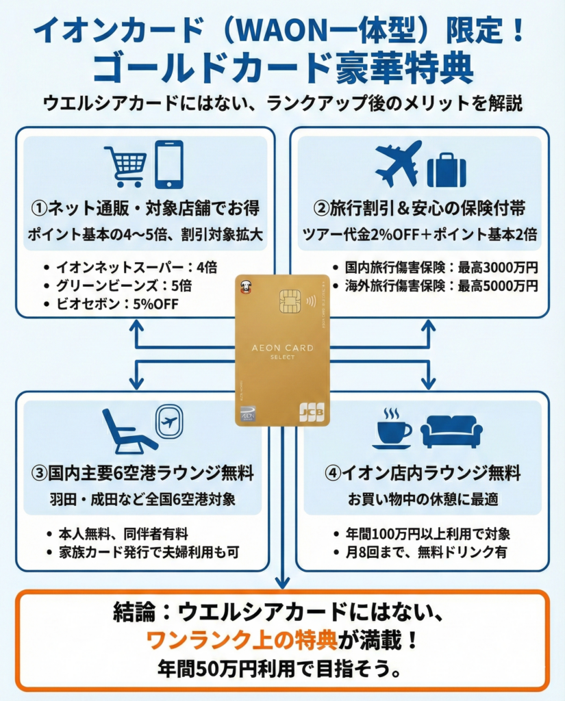 ウエルシアカードはゴールドカードにランクアップできないため、イオンカード(WAON一体型)ならではの特典である。