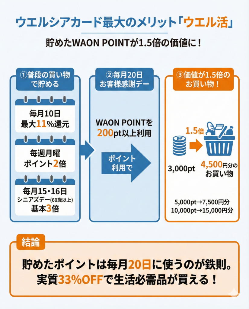 ウエルシアカード最大のメリットは、貯めたWAON POINTを効率よく使える「ウエル活」ができるということだ。