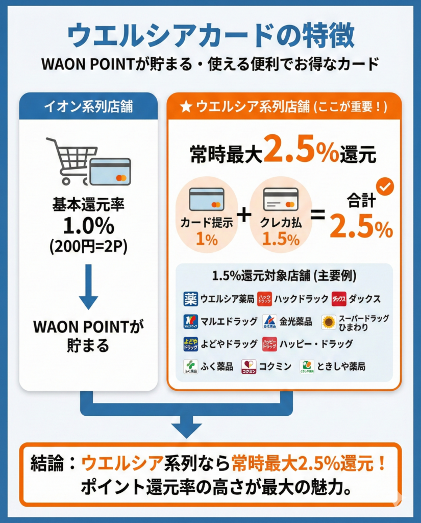 イオン系列だとWAON POINTは基本の1.0%還元されるが、ウエルシア系列なら常時最大2.5%還元されるため、ポイント還元率が高いのが大きな特徴である。(カード提示で1%、クレジットカード払いで1.5%のポイント還元)