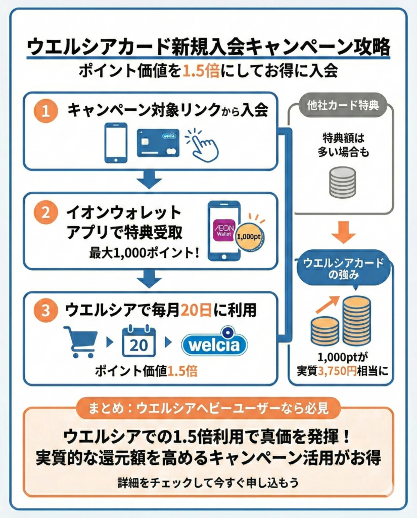ウエルシアカード入会で、1,000WAON POINTが進呈される特典について解説した。