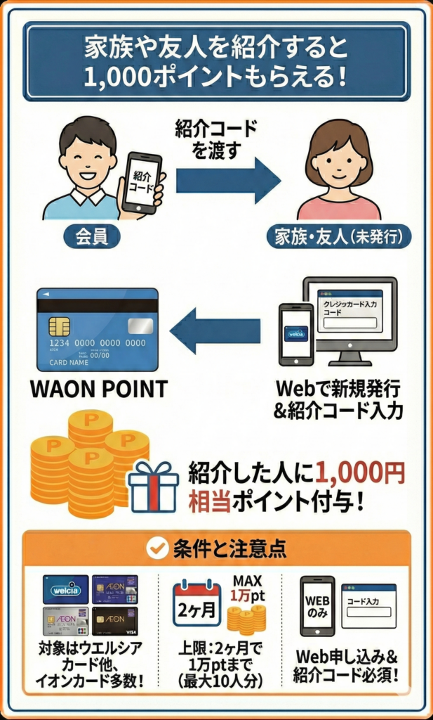 ウエルシアカード会員が家族や友人を紹介し、紹介を受けた人が紹介IDを入力のうえインターネットより新規入会・カード発行されると、紹介者に1,000WAON POINTが進呈される。