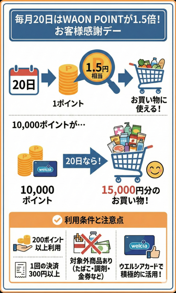毎月20日の「20日お客様感謝デー」なら、ウエルシアグループ対象店舗でWAON POINTが1ポイント1.5円分として利用できる。