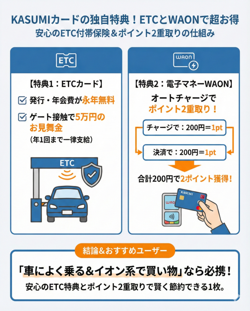 KASUMIカードは、電子マネーWAONのオートチャージを活用したポイントの二重取りができます。