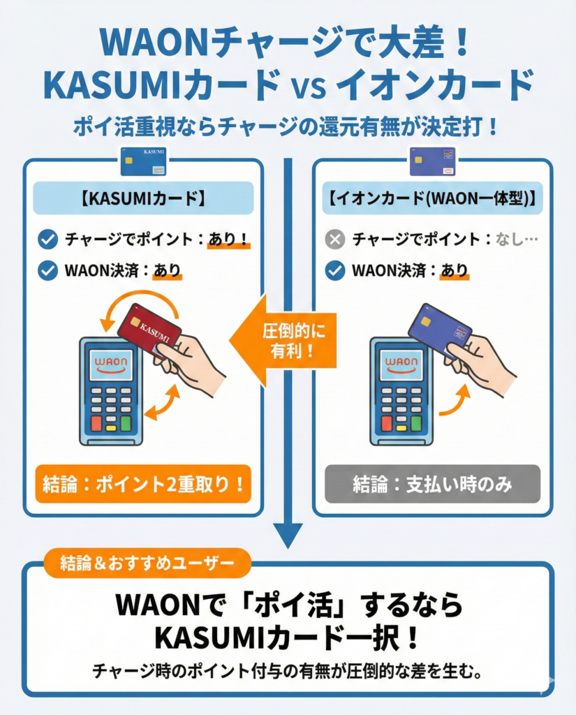 KASUMIカードは、イオンカード(WAON一体型)とは異なり、WAONのオートチャージでポイントが貯まります。