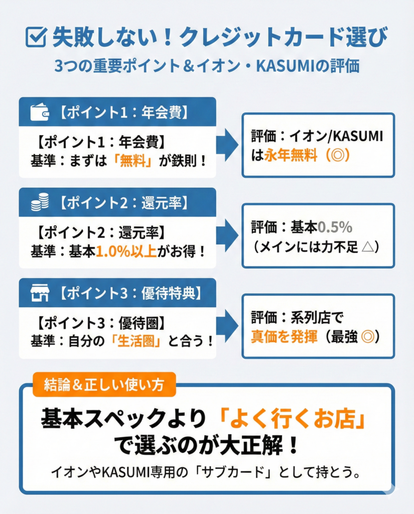 イオンカード(WAON一体型)とKASUMIカードは、基本的に年会費無料です。持っているだけでコストが発生しないため、「とりあえず作っておく」という選択でも損をすることはありません。まずは気軽に持ち始めることができるカードと言えます。