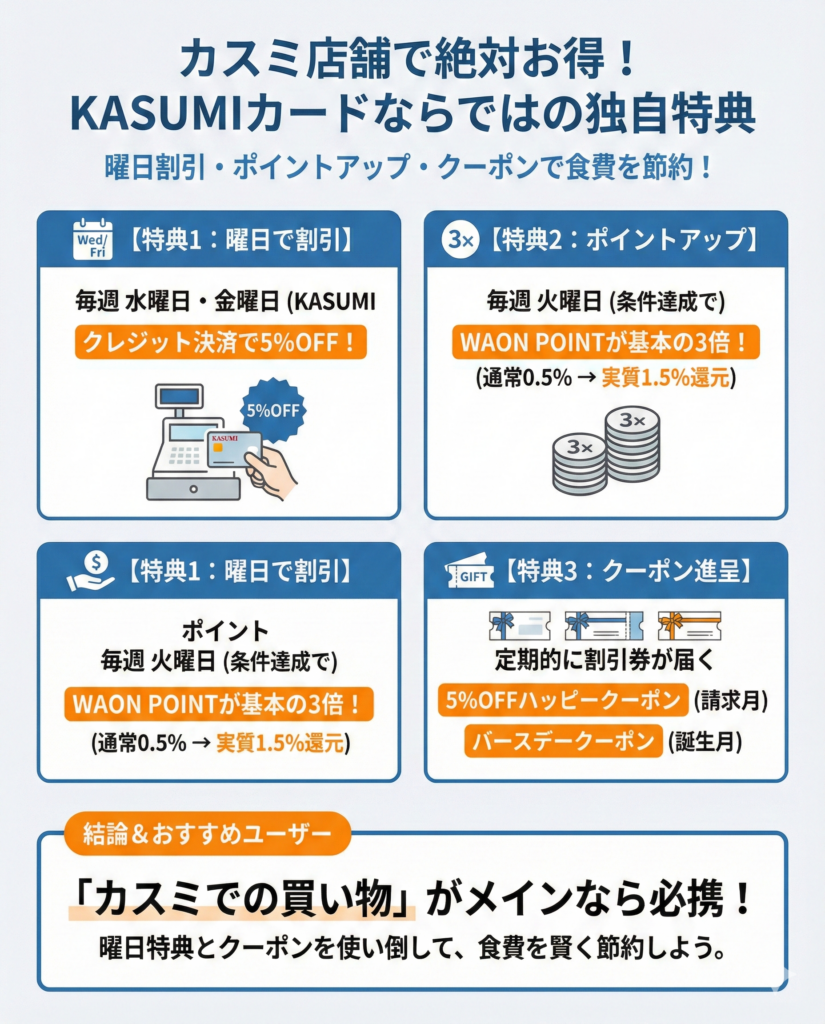 キャンペーン以外にも、KASUMIカードには魅力的な特典が用意されています。毎週水曜日と金曜日の「KASUMIハッピーデー」では、KASUMI店舗でのクレジット決済が5%引きになります。また、クレジット決済を利用すると請求月に5%引きクーポン(ハッピークーポン券)がもらえ、誕生月にはバースデークーポンも受け取れます。