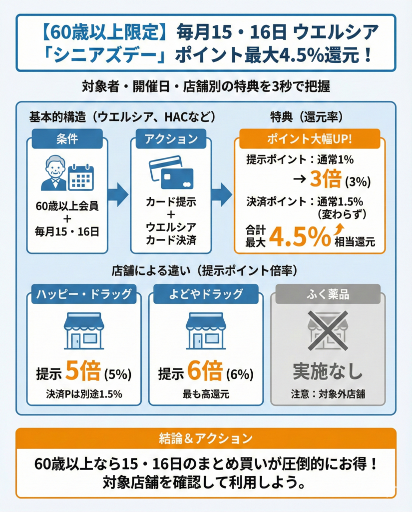 - 毎月15・16日はシニアズデーでポイントが3倍になる