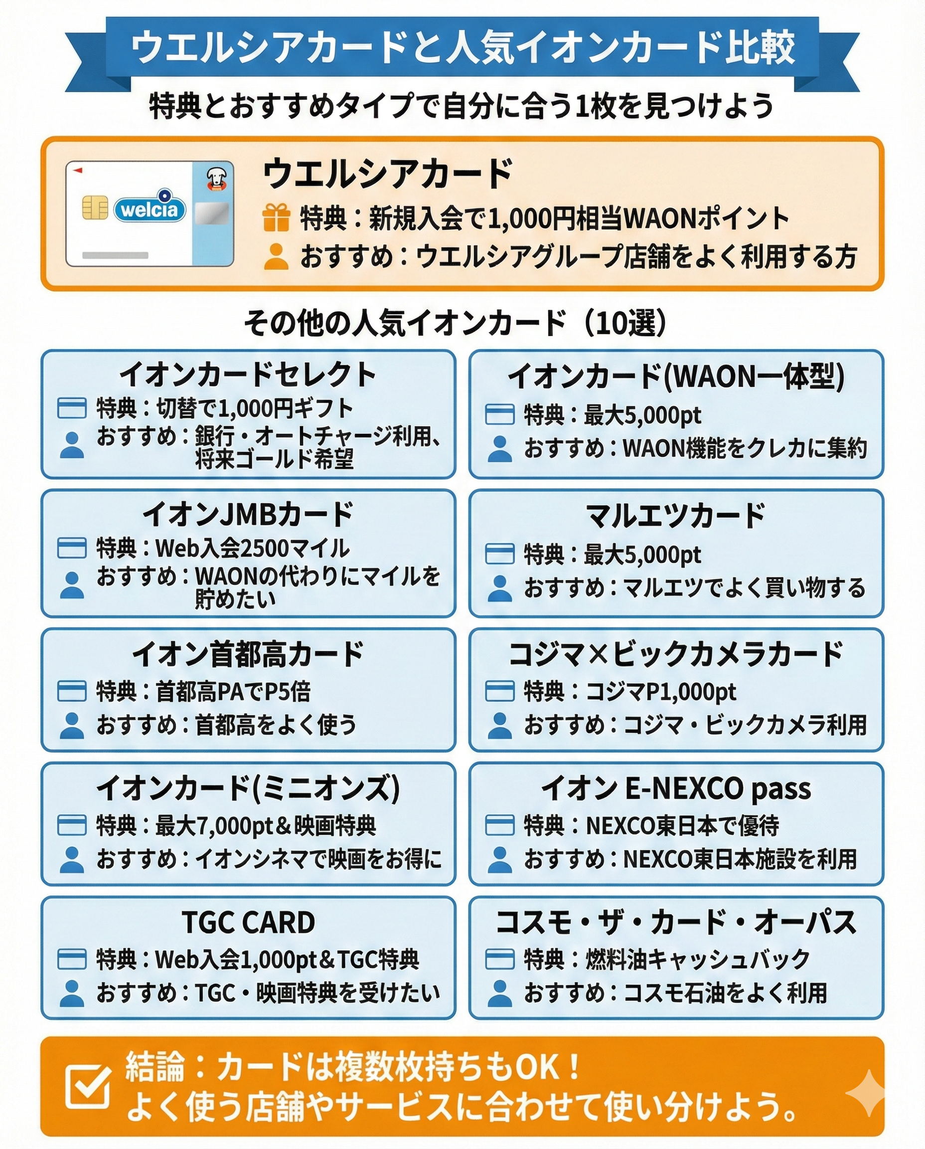 以下では、ウエルシアカードと以下10種類における人気のイオンカードの新規入会特典や向いている方の特徴を解説するので、ぜひ目を通していただきたい。
