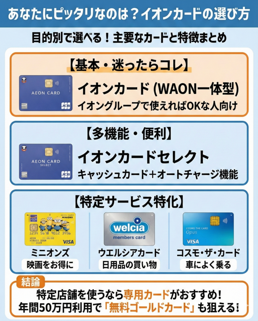 特にこだわりがない場合はイオンカード(WAON一体型)、機能やお得な特典を重視する場合はイオンカードセレクトや特定サービス向けのカードを選ぶと良いだろう。
