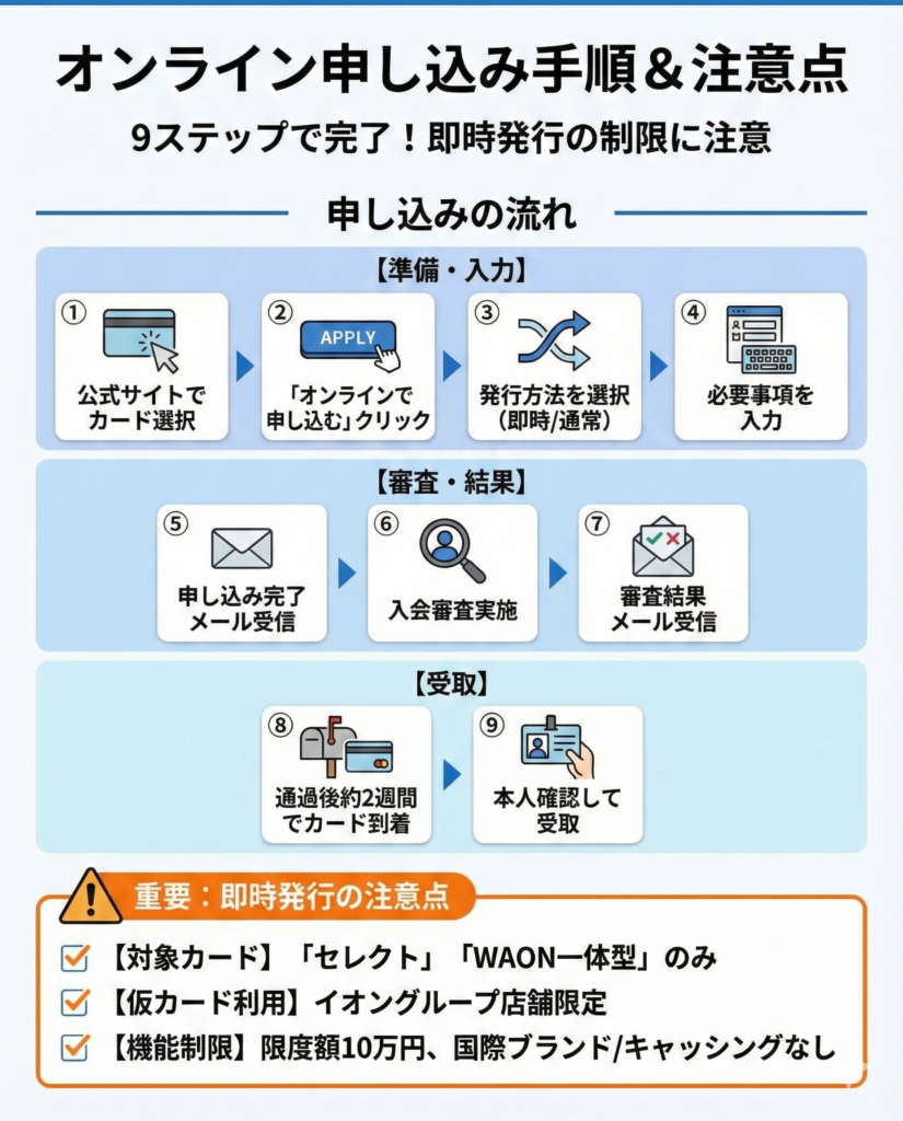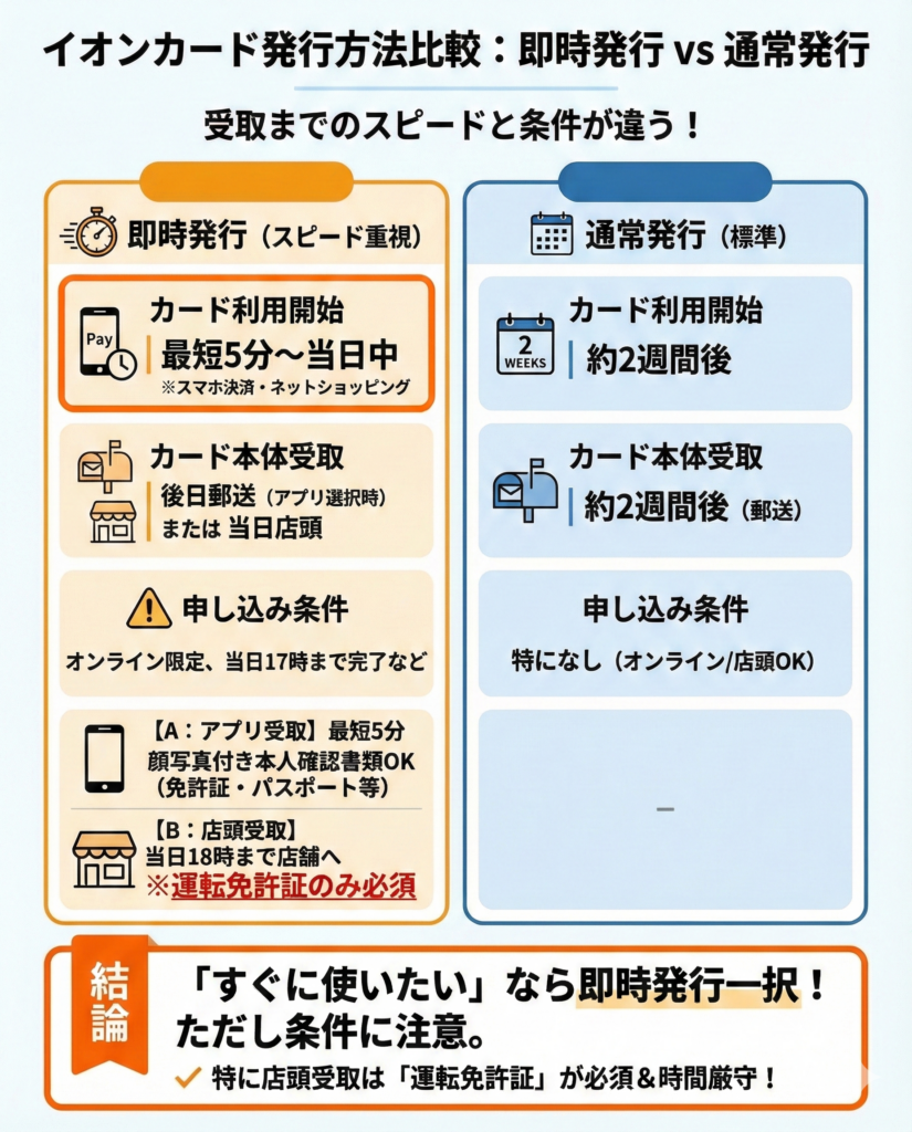 当日利用を重視する場合は、イオンウォレット即時発行やカード店頭受取りサービスの条件を確認して活用しよう。