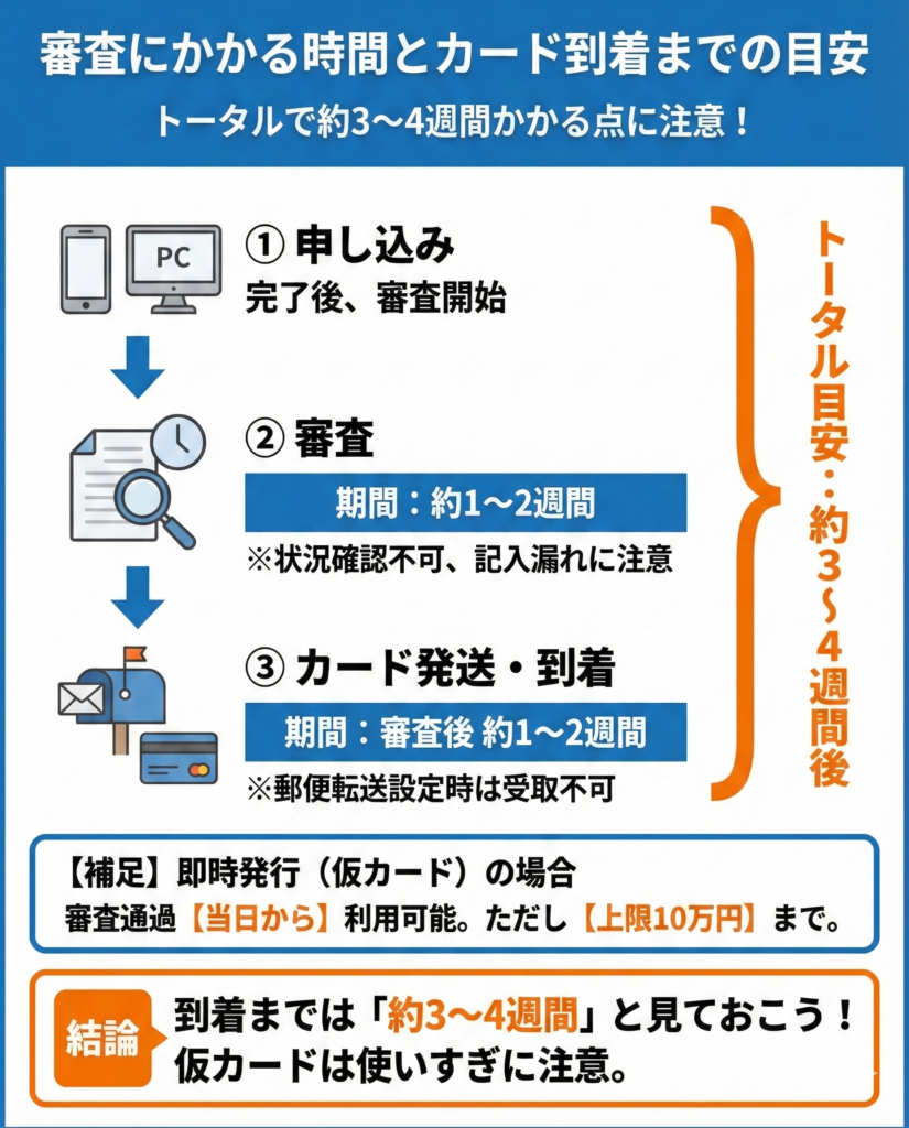 通常申し込みでは本カードは約2〜3週間で届き、即時発行では申込方法に応じてアプリ上のカード番号や店頭受け取りの即時発行カードを当日利用できる場合がある。