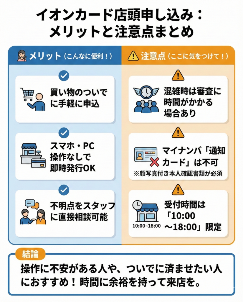 店頭の場合はスマホやPCを使わずにイオンカードへ申込でき、スタッフに相談しながら手続きを進めやすい。