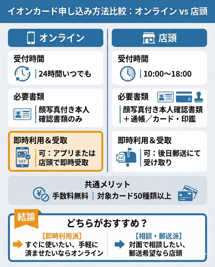 イオンカードの申し込みはオンラインと店頭で行えるが、スマホひとつで申し込みを進めやすく、即時発行も選びやすい点から、オンラインの方がおすすめと言える。