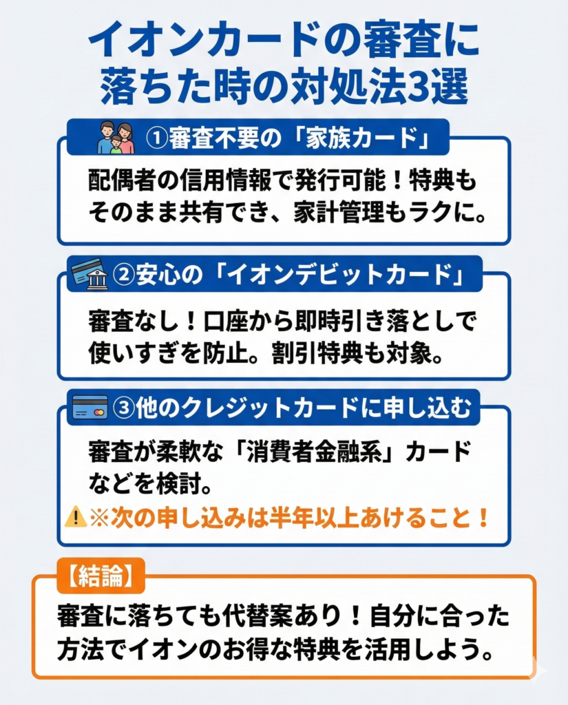 状況に応じて、家族カードやイオンデビットカードを検討する方法もある。