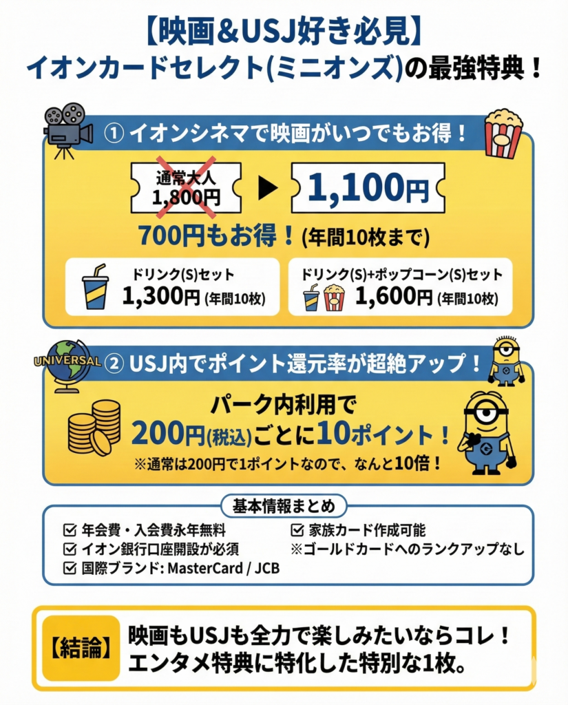 イオンカードセレクト(ミニオンズ)は、イオンシネマとユニバーサル・スタジオ・ジャパンでの特典を活用できるのが大きな魅力だ。