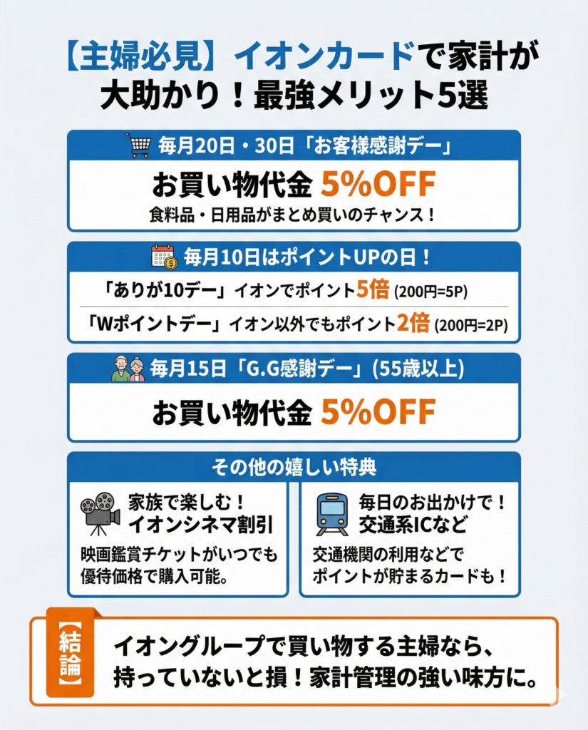 主婦がイオンカードを持つことで、イオングループでの買い物が非常にお得になり、家計全体の管理がしやすくなることが最大のメリットだ。