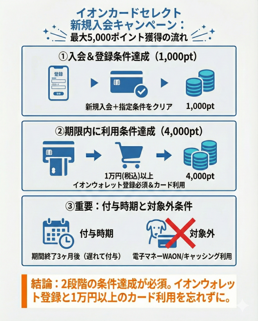 イオンカードセレクトへ新規入会し、条件を満たすと最大5,000WAONポイントを獲得できるというもの。受け取れるのは「最大」5,000WAONポイントなので、確実にゲットするためには指定期限内に一定の条件を満たす必要がある。