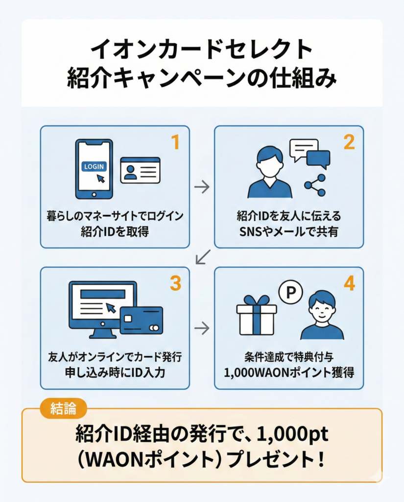 イオンカードセレクトを知人に紹介し、入会に至った場合、紹介キャンペーンの特典として1,000円相当WAONポイントがプレゼントされる。