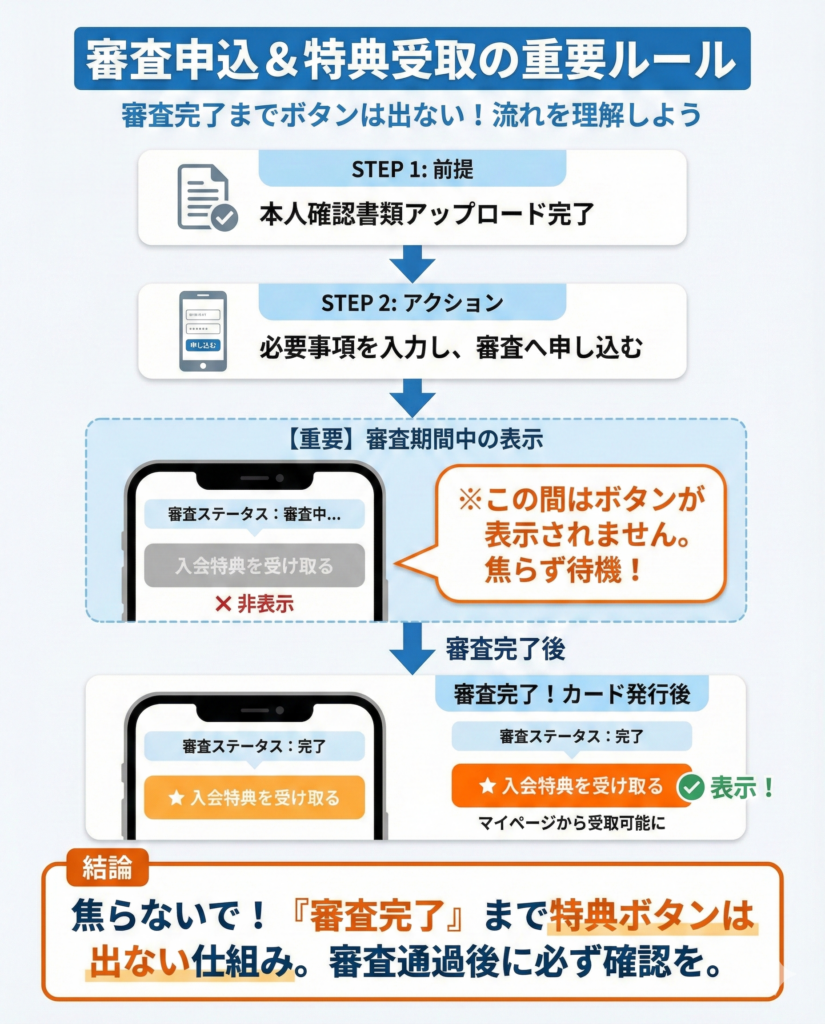 イオンカードでは、カード発行の審査が完了するまで「入会特典のポイントを受け取る」ボタンが表示されない仕組みとなっているので注意しておこう。