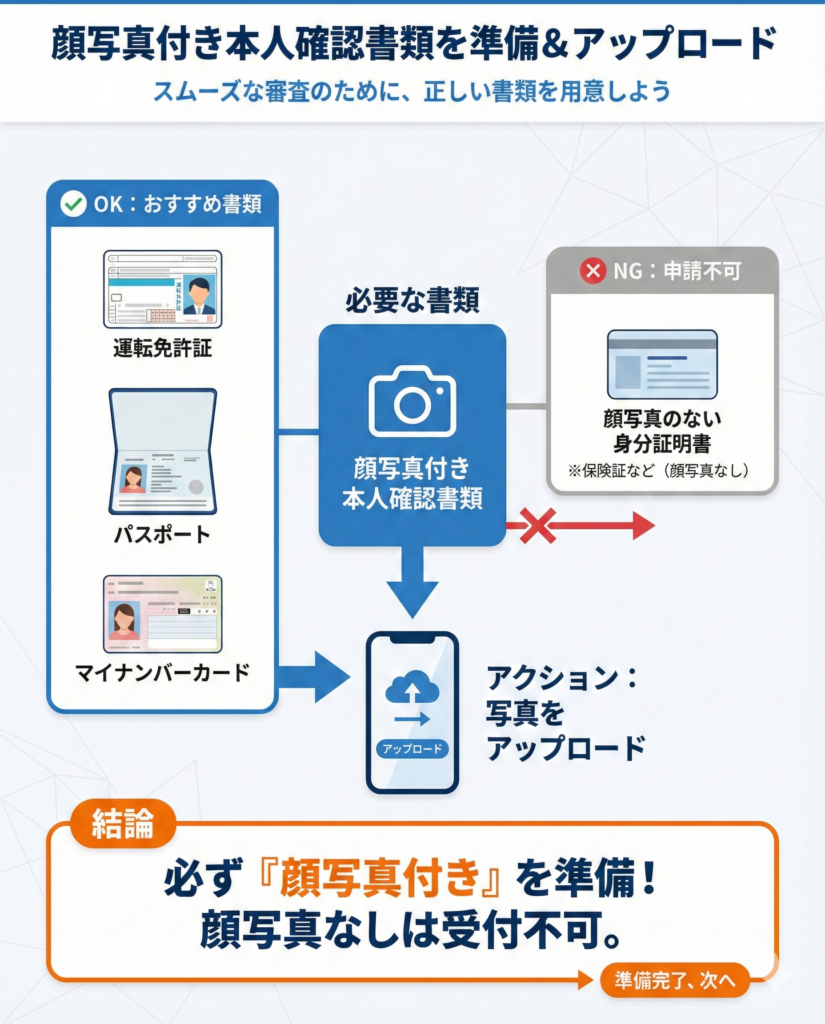 - 顔写真付きの本人確認書類の写真をアップロードする
