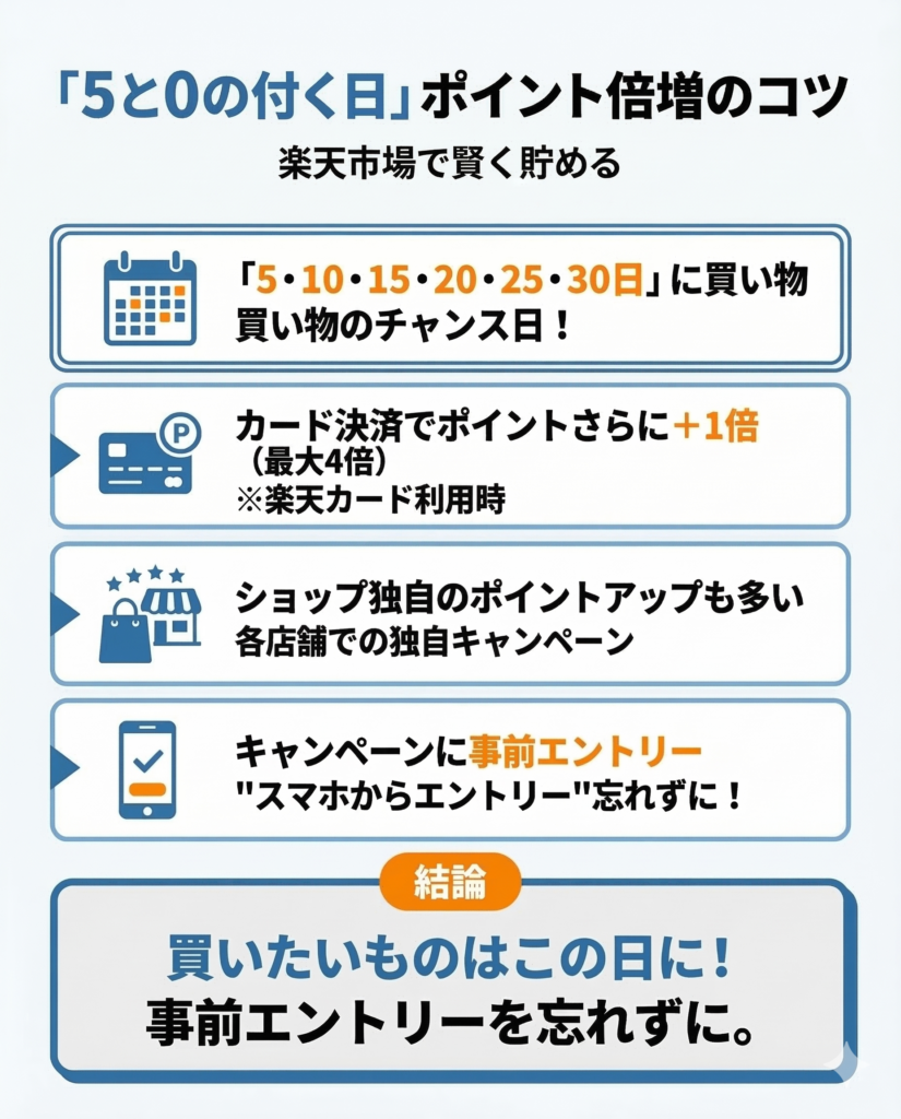 買いたいものがあるなら、5日、10日、15日、20日、25日、30日のいずれかに買い物をするのが、賢くポイントを貯めるコツである。