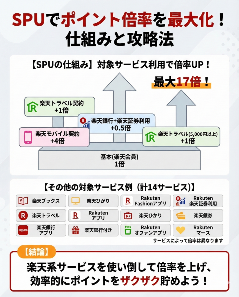 楽天カードには、スーパーポイントアップ(通称:SPU)というサービスがある。これは、対象サービスの条件を達成すると、楽天市場でのポイント倍率が上がっていくというものだ。